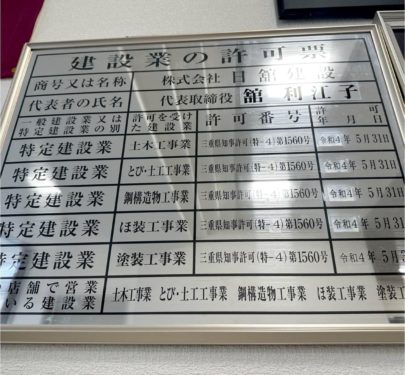| 許可 | 土木工事業 とび・土工工事業 三重県知事許可(特-4)第1560号 |